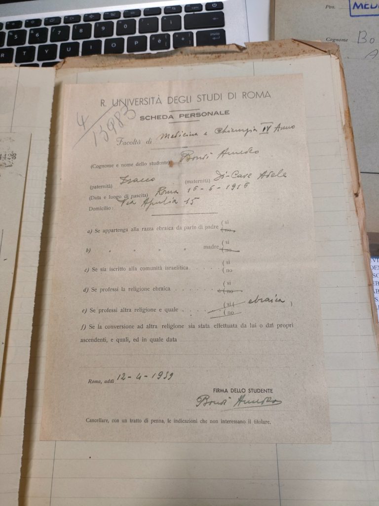 I fascicoli personali degli studenti, oggi al centro di nuove ricerche, aprono un campo di studio fondamentale: attraverso questi documenti è possibile ricostruire biografie e reti famigliari, ridare un nome e una storia a chi è stato ridotto a numero o a pratica burocratica. È anche attraverso questi materiali che emergono le storie delle famiglie delle comunità ebraiche romane, come nel caso di Elio Pavoncello (https://1938-sapienza-leggirazziali.it/Sito/percorso.php?id=122), studente di Lettere espulso dalla Sapienza, ricordato il 16 ottobre del 2024.