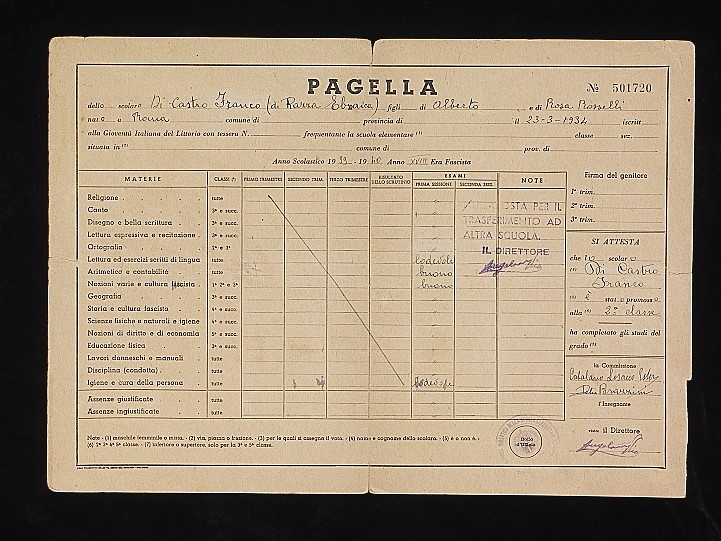 Anni fa, io e mia moglie Daniela stavamo controllando una vecchia scatola di fotografie e documenti. Improvvisamente il mio sguardo e la mia mano si posarono su due documenti ingialliti e con i bordi consumati dal tempo. Erano due pagelle scolastiche, la prima dell’anno 1939-1940, XVIII Anno dell’Era Fascista, la seconda del 1940-1941, XIX Anno dell’Era Fascista, differente in quanto aveva un’intestazione in alto con la scritta “Sezione Ebraica”. Il nome, scritto con una grafia ordinata sia sulla prima che sulla seconda pagella era quello di mio suocero: Franco Di Castro.